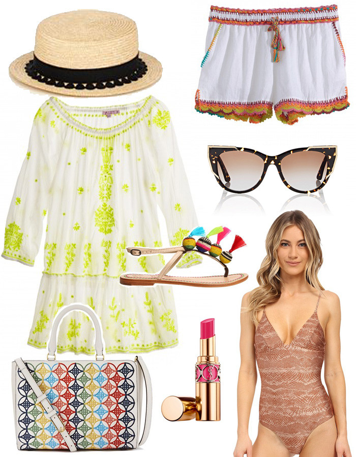 Eugenia Kim Marcel Boater Hat // Calypso St. Barth Crochet Trim Linen Shorts // Calypso St. Barth Nayri Embroidered Cotton Dress // Thierry Lasry Butterscotchy Sunglasses // Jaiya Tassel Beaded Sandals // Amuse Society Esther Snake One Piece Swimsuit // Tory Burch Robinson Embroidered Small Zip Tote // YSL Rouge Volupte Shine Oil-in-Stick Lipstick
