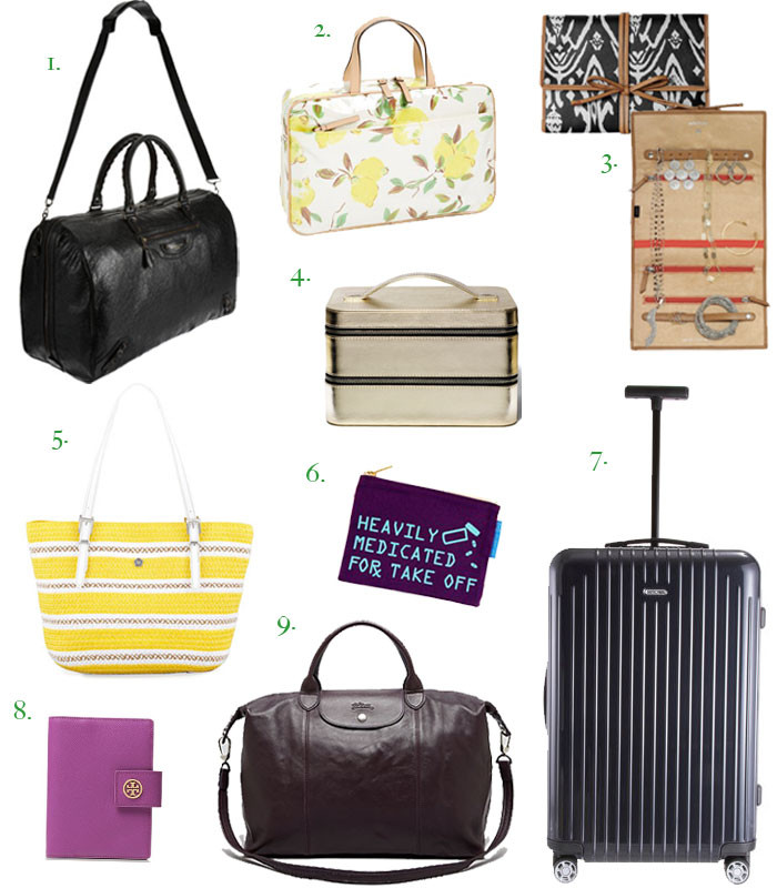 1. Balenciaga Voyage 24H (Weekender bag) // 2. Kate Spade Limoncello Manuela Cosmetics Case (for all of your travel beauty products) // 3. Stella and Dot Jewelry Roll, Ikat // 4. Bobbi Brown Old Hollywood Train Case (for all of your makeup and brushes) // 5. Eric Javits Squishee Tote Bag, Yellow Mix // 6. Flight 001 Heavily Medicated Travel Pouch // 7. Rimowa Salsa Air 26″ Multiwheel Luggage // 8. Tory Burch Robinson Large Passport Holder // 9. Longchamp Satchel Le Pliage Cuir Large