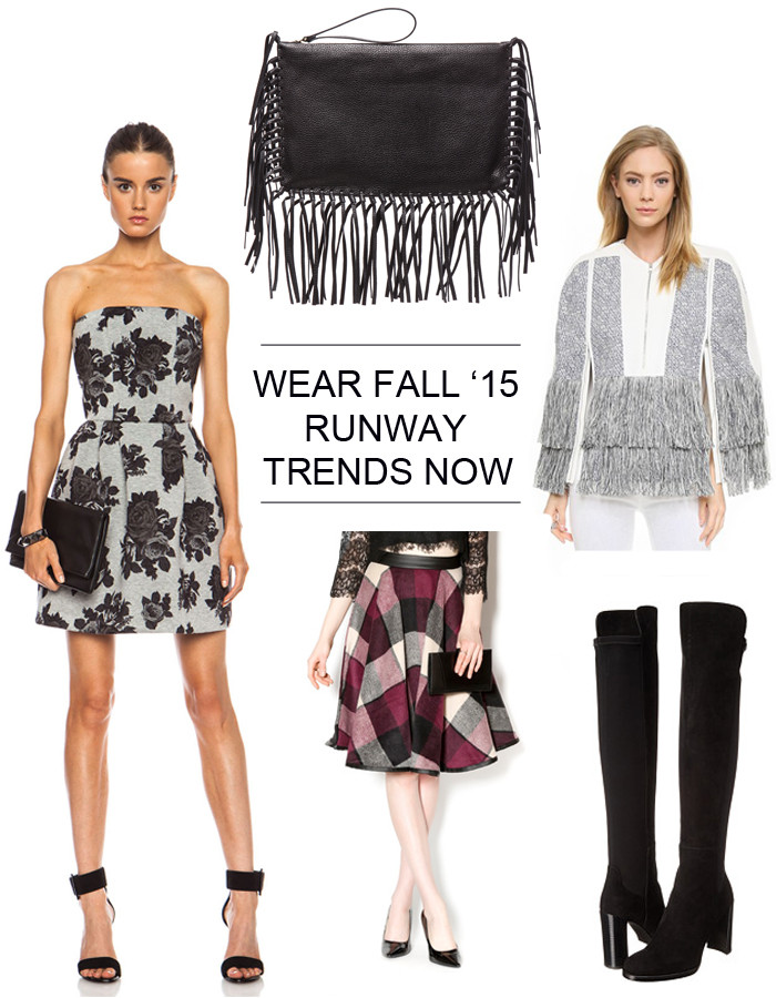 Just because we can’t buy what was on the New York Fashion Week runways last week, doesn’t mean you can’t rock the Fall 2015 trends now! From fringe to it-girl coats, over-the-knee-boots and red plaid, I’ve got you covered with inspiration on what to buy now and wear this spring! Shop these curated pieces by clicking the images above or links below: