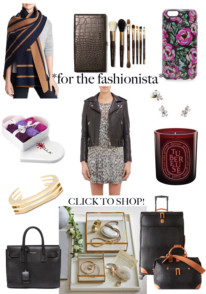 It’s that time of year again – HOLIDAY GIFT GUIDES! I have to say I love making gift guides because it is fun to shop for my family and friends while working at the same time! This year I found so many goodies it was hard to narrow it down, but I promise, after searching high and low, these are the best presents I could find! Today is all about the FASHIONISTA! Whether your mom, sister, wife, girlfriend or co-worker fits this description – these things will be high on her list! Keep checking back all week and month long for more gift guides for HIM, WHITE ELEPHANT, MOM, BEAUTY JUNKY AND HOSTESS! Shop the guides by clicking the images above or corresponding links below!
