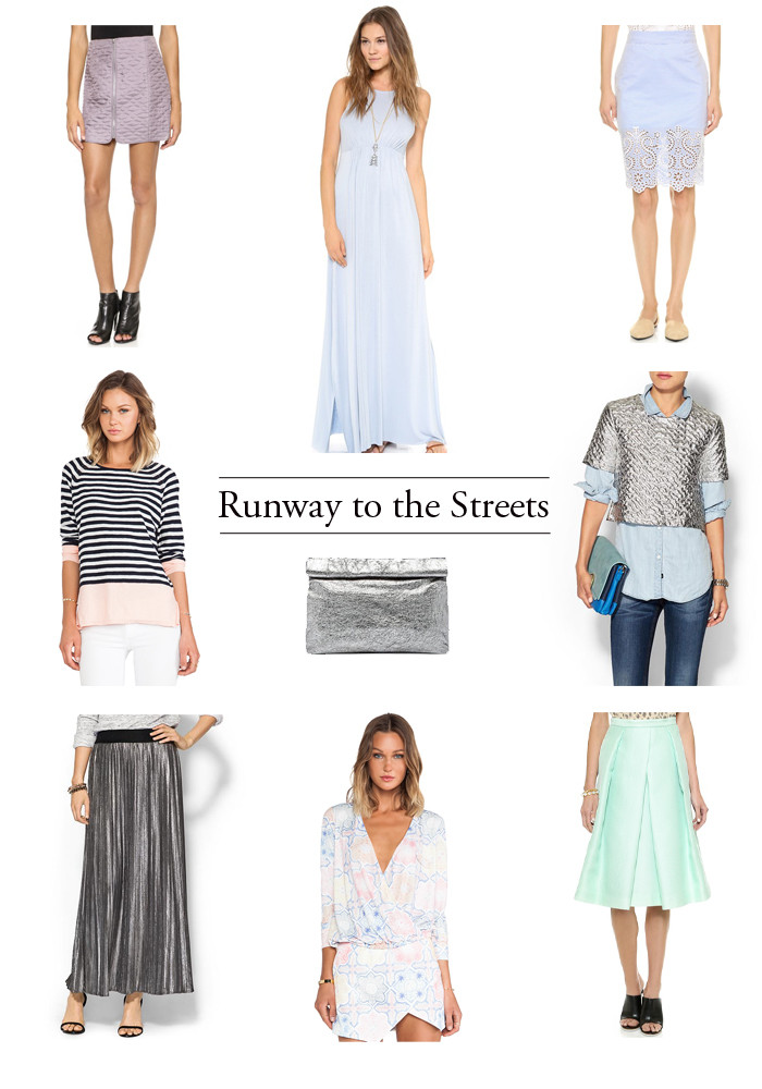 There were some major trends coming from the runway last week. Pastels from Rebecca Minkoff, BCBG, Tadashi Shoji, Monique Lhuillier and more, metallics from Zimmermann, capes and billowing shapes across the board were just a few of my favorites for spring, but how can you incorporate them into your fall wardrobe? Here are some great pieces that you can wear now and well into spring! Shop by clicking on the items above or the corresponding links below: