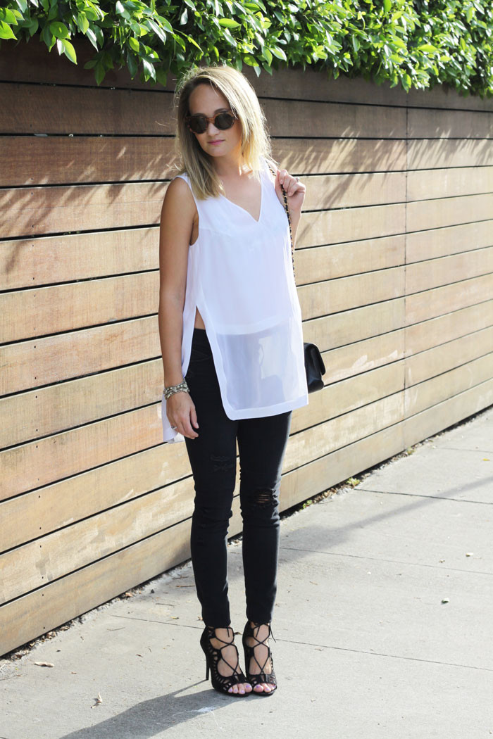 Robert Rodriguez Silk Overlay Tank Top // RTA Distressed Denim, Black // JustFab Vernon Heels // vintage Chanel Handbag // Raen Optics Arkin Sunglasses // Gorjana Kensington Ring (similar here) // Silver Bracelet (similar here) // Nasty Gal Lilah Bralet